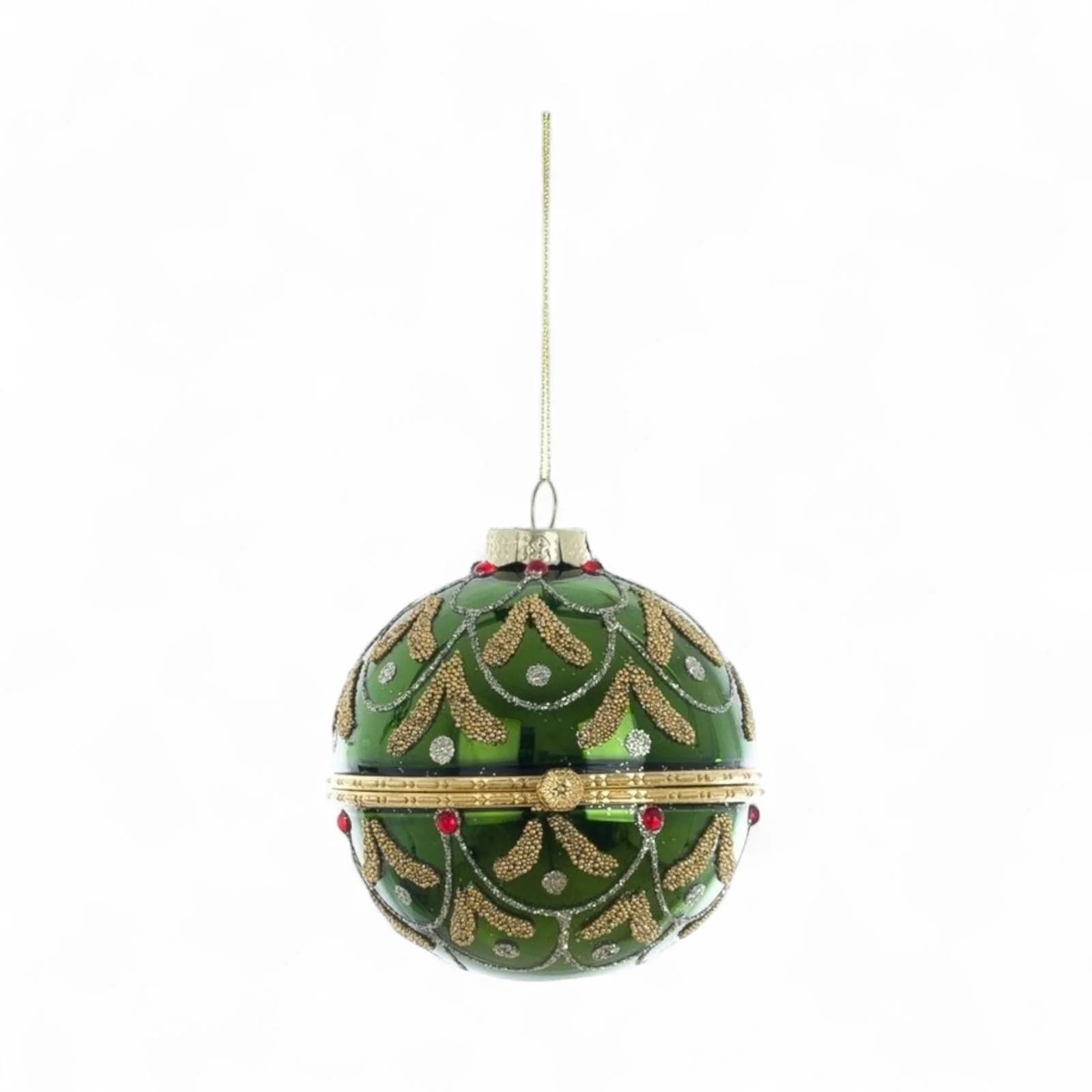 Questa sfera in vetro firmata Blanc Mariclò è un addobbo natalizio dal fascino retrò, con un elegante fondo verde arricchito da ricami glitterati oro e dettagli multicolore. Il suo design unico, che si apre come un piccolo scrigno, la rende un pezzo raffinato, ideale per donare all’albero di Natale un tocco di nostalgia e luminosità preziosa. Perfetta per chi cerca un ornamento suggestivo e ricco di tradizione.