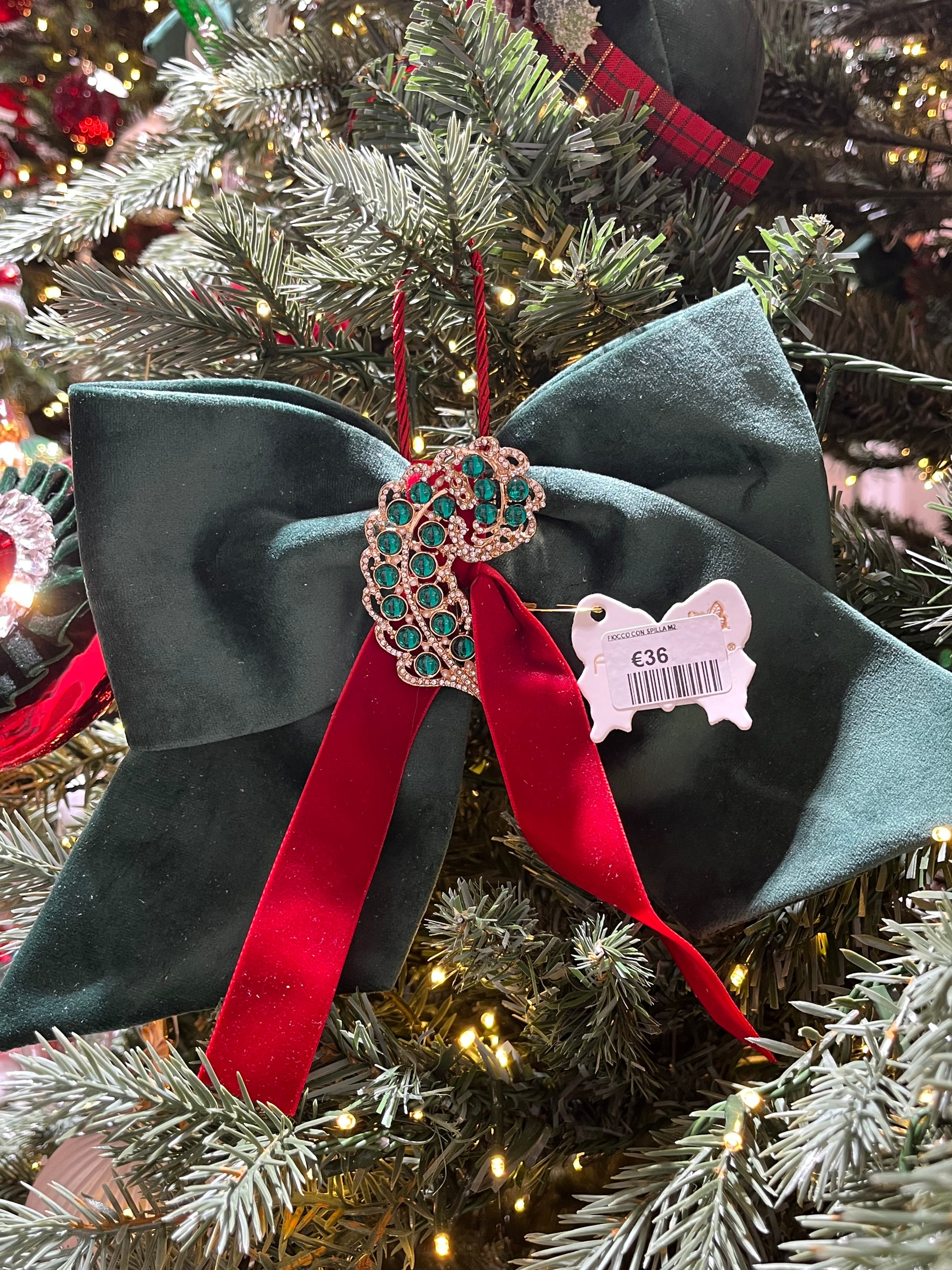 Fiocco Fiori di Lena, in questo speciale velluto verde arricchito dal nastro rosso acceso e dalla inconfondibile spilla piuma