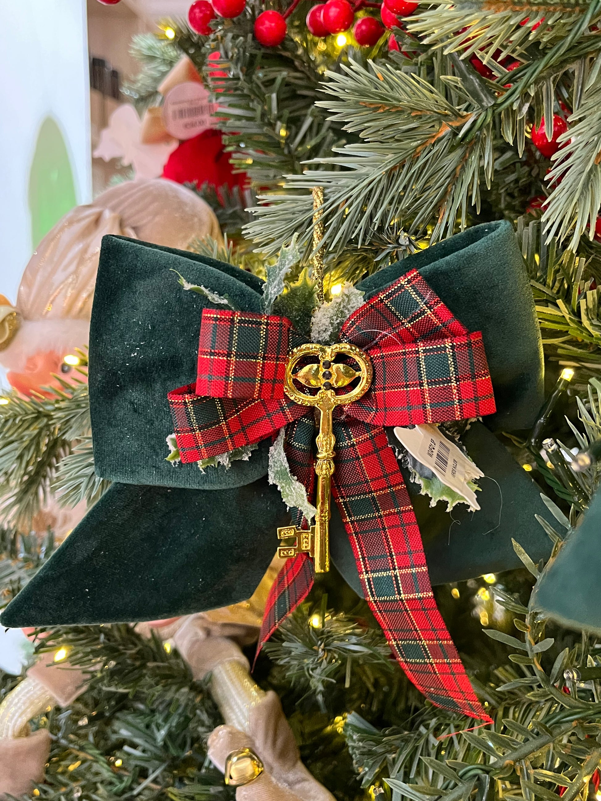 Fiocco Fiori di Lena, in questo speciale velluto verde arricchito dal nastro scozzese e dalla inconfondibile spilla chiave
