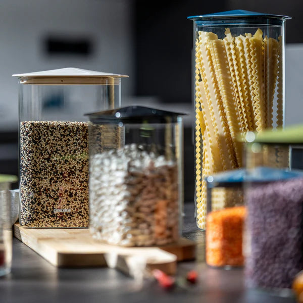 La forma rettangolare e il design impilabile rendono questo barattolo ideale per ottimizzare lo spazio in dispensa, sul piano cucina o nel frigorifero.
