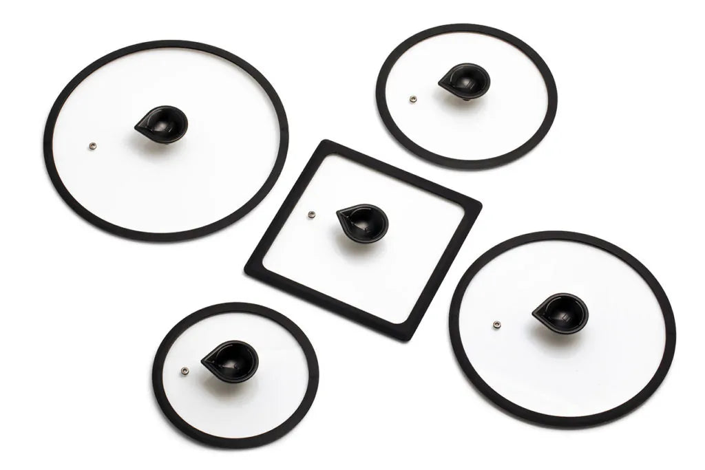 Vetro temperato con pomello in alluminio e bordo in silicone, resistente al calore.