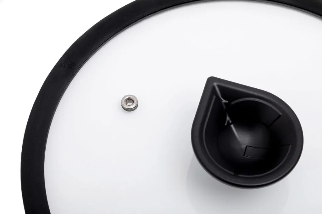 Vetro temperato con pomello in alluminio e bordo in silicone, resistente al calore.