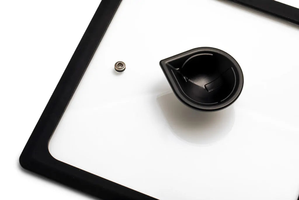 Vetro temperato con pomello in alluminio e bordo in silicone, resistente al calore.