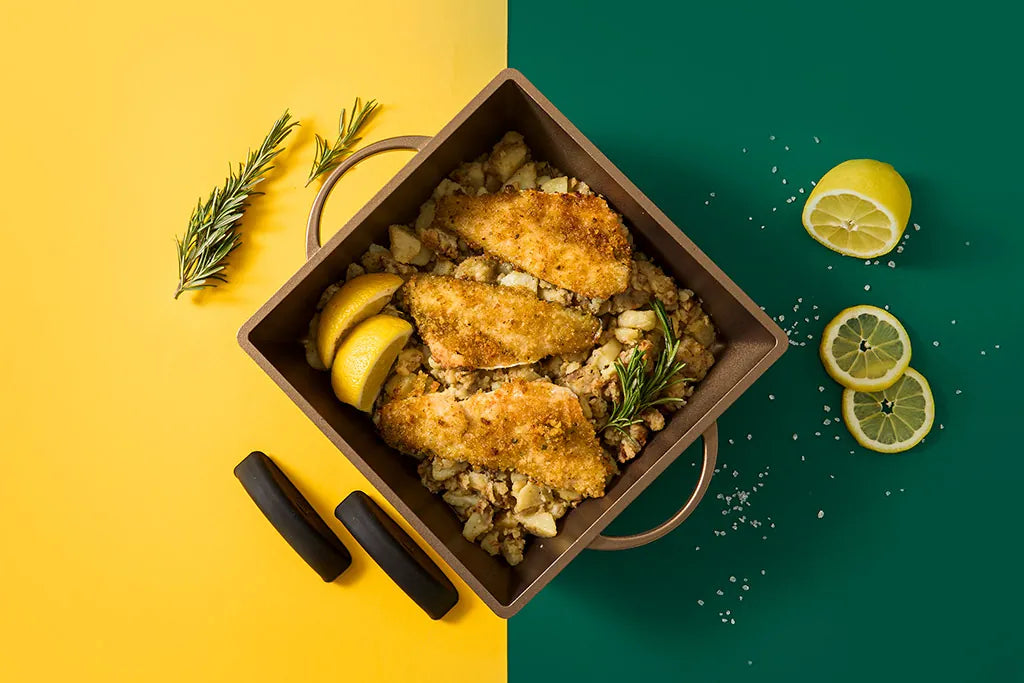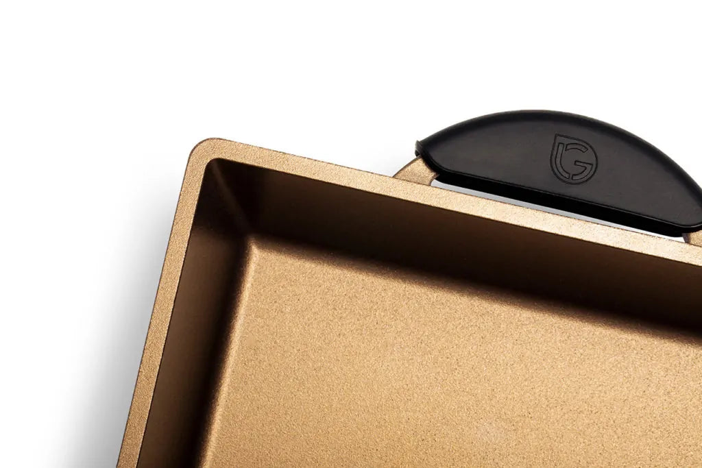 Quadrata handmade in Italy dal design innovativo, pensata per chi ama una cucina salutare. Maniglie fisse in alluminio integrale con presine in silicone. Superficie di cottura più ampia, facile da pulire, flessibilità di stoccaggio ed esclusivo utilizzo in forno. PFOA, Nickel free.