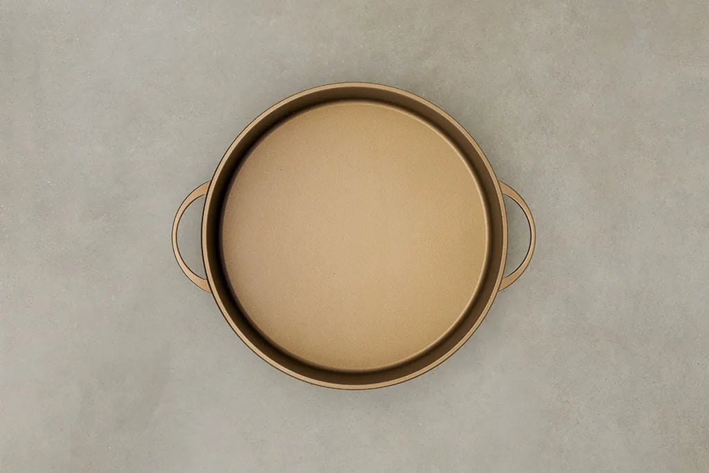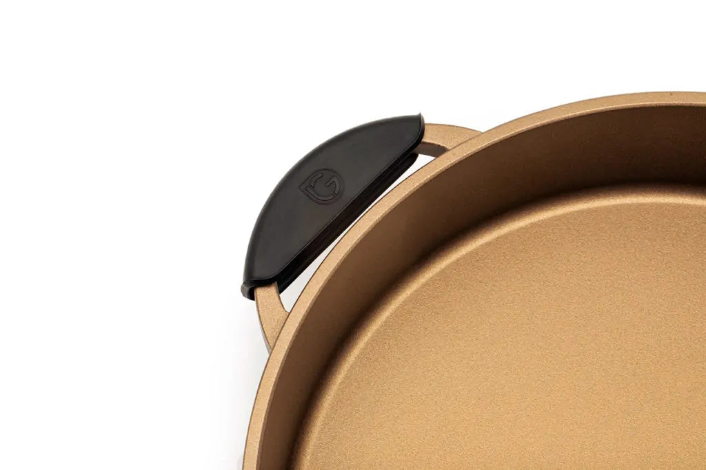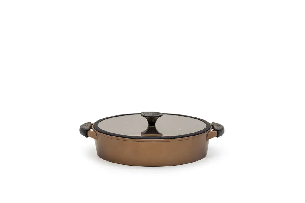 Tegame handmade in Italy dal design innovativo, pensato per chi ama una cucina salutare. Maniglie fisse in alluminio integrale con presine in silicone. Superficie di cottura più ampia, facile da pulire, flessibilità di stoccaggio ed esclusivo utilizzo in forno. PFOA, Nickel free.