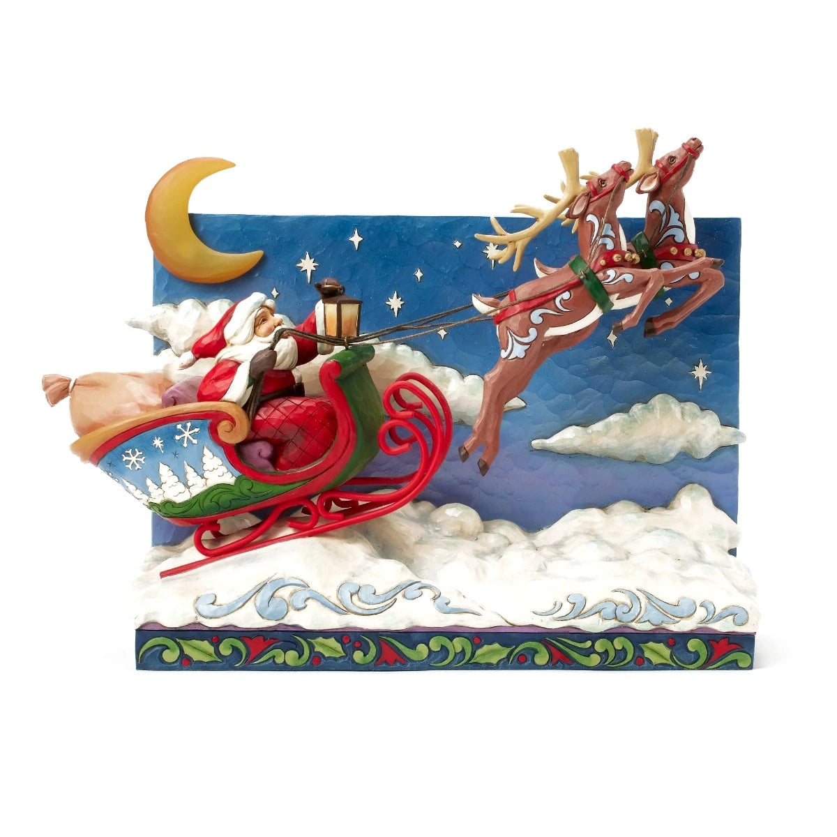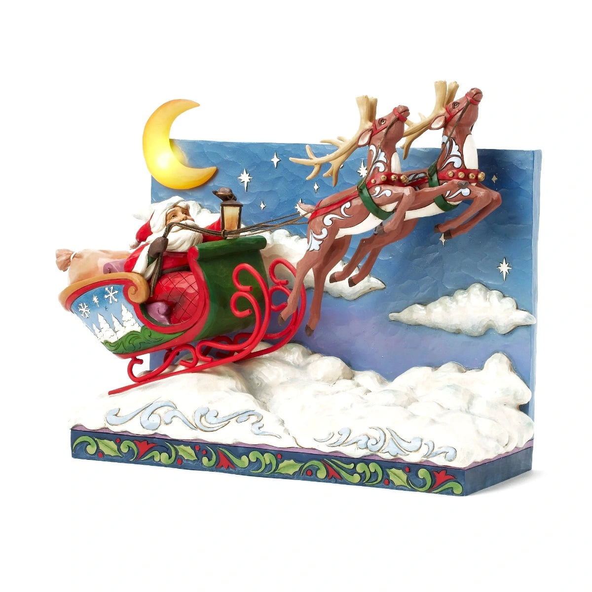 Questa splendida e lussuosa scena di Babbo Natale si illumina con luci a LED per illuminare il magico volo di Babbo Natale nel cielo notturno con le sue renne. Guidate dalla luna, dalle stelle e dalla lanterna, le renne si librano in volo sulle note di "Jingle Bells". Funziona con 3 batterie AAA (non incluse) dotato di timer di accensione/spegnimento automatico, timer 6 ore acceso - 18 ore spento. Prodotto realizzato in resina dipinta a mano effetto legno, creato dall'artista Jim Shore per la collezione Heartwood Creek.